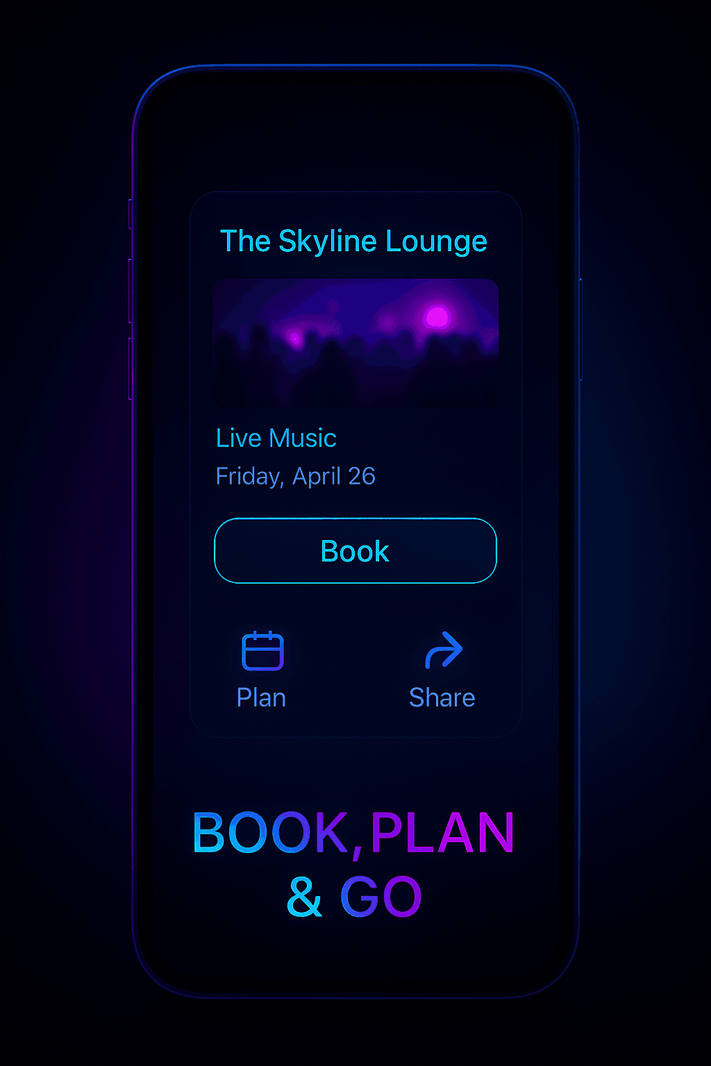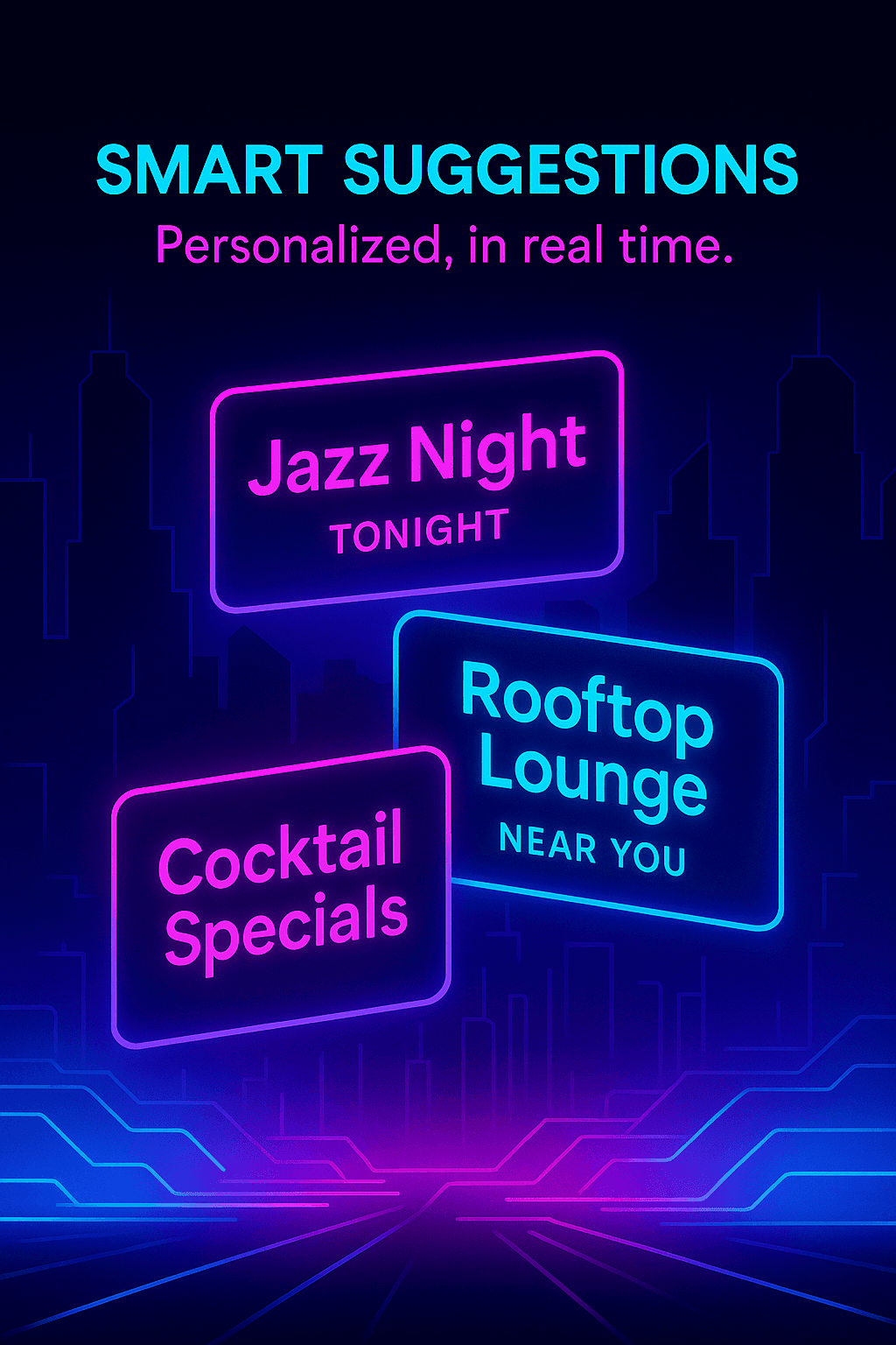 It’s about discovering your vibe — whether it’s a rooftop cocktail, a jazz set, a packed club, or a quiet quiz night — all personalized by AI, in real time.